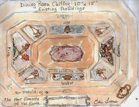 Offered Painting Techniques All painting techniques used on jobsites by The Edie Irons Studio are water-based, lightfast and most ecologically friendly ingredients. Oil paintings are done on canvases. Buon Fresco painting - Italian, translation - “True Fresh” It is said a fresco gives off its own light and is therefore considered the pinnacle of the painterly arts. The pure pigments are ground into a fine powder then mixed with distilled water and laid into a layer of wet aged lime. As the pigments and wet lime dry together, they form colored crystals on the surface. “Fresco-Like” Painting Technique This technique closely resembles True Fresco, as it also has translucent qualities allowing light to come through the pigments. With far less cost and rapid completion time, it is the usual choice. Metallic Finishes on Walls or Ceilings Unusual artistic finishes are available, with addition of textures and patinas also possible. Wall Finishes Slight variations in color tones on walls and ceilings resemble “aged plaster”, adding rich neutral backdrops to rooms. Accent Walls in Hand-carved Plaster This hand carving technique produces a sculpture-like effect of simply “white and shadow”. Alternatively, it is done as an inset into a wall. Custom Large-Scale Wall Hangings and Custom Canvases: Priced up front according to subject matter and size specifications. Completed Canvases for Sale Please enquire. At this time approximately 20 finished canvases exist. These are of varied subject matter in mediums of oil, metallic, gouache, acrylic and fresco. |