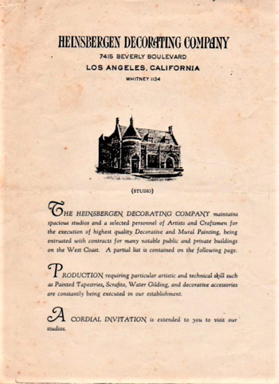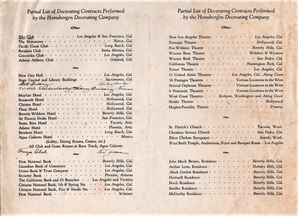 In 1989 Edie purchased a comprehensive mural resource library from a rare books store. This library formerly belonged to The Anthony Heinsbergen Decorating Company in Los Angeles. Today, museums hold his small works while efforts continue to salvage and restore grand-scale works in themed theaters, hotels and residences. The collection contains thousands of pages of rare European fresco drawings, photos showing the original furnishings and décor of hotels, clubs and temples, fashion and many great Art Deco examples. Included is an entire collection of colored renderings by architectural firms such as John Eberson and Boller Bros. depicting the “Atmospheric” Theaters adorned by Heinsbergen’s murals and architectural painting. 'These materials combined with Edie’s forty-year collection provide a massive resource of unusual materials. |